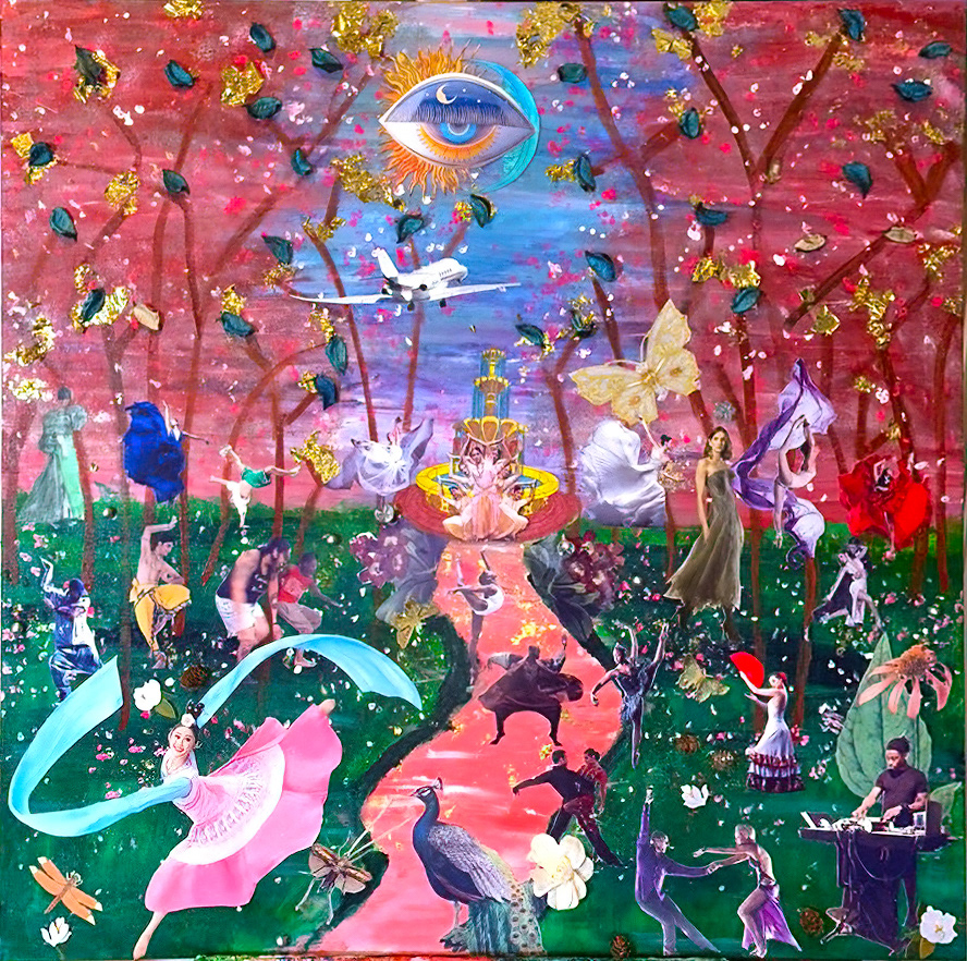 Acrylic Paints, Paper, Gold Leaf, Dried Wood, Faux Pearls